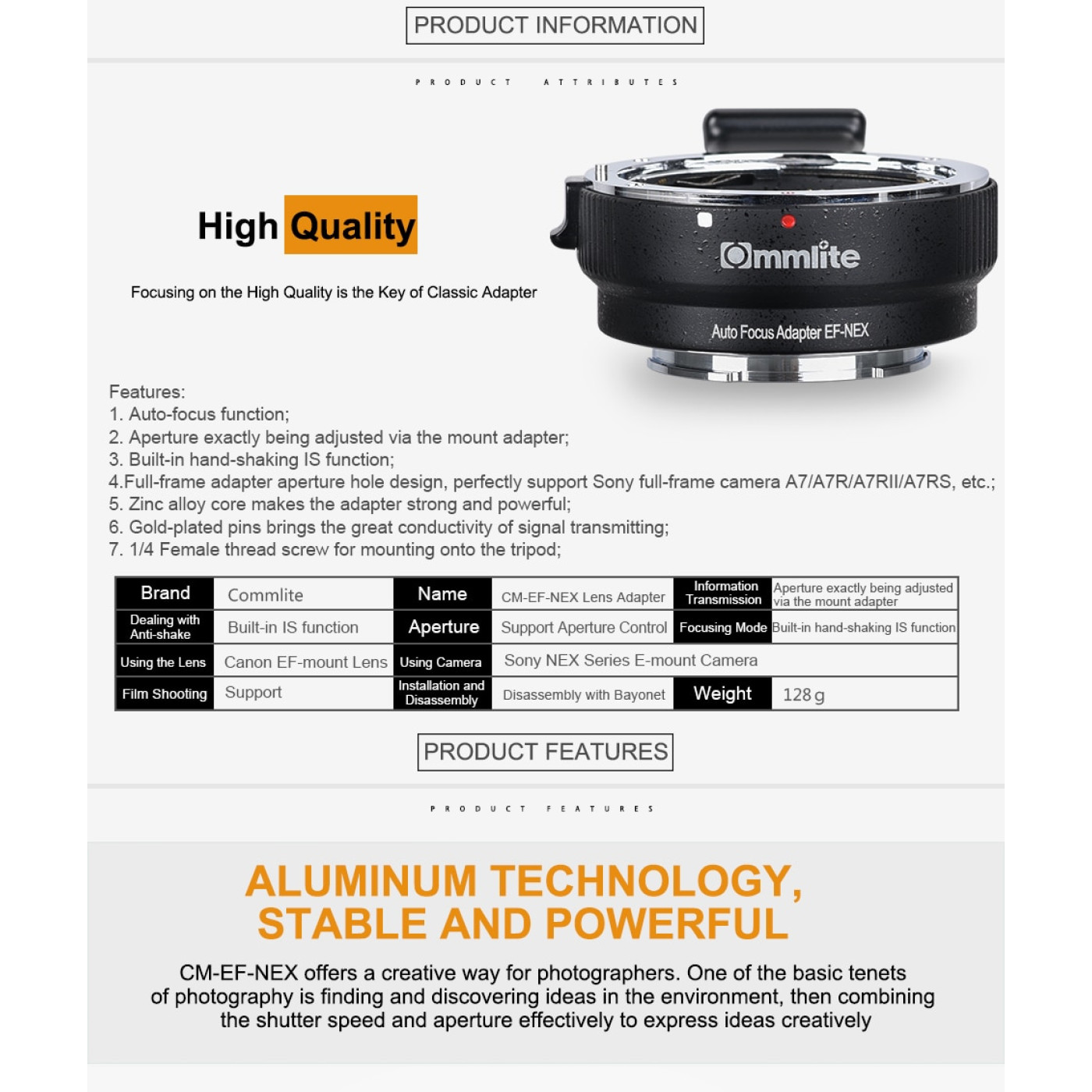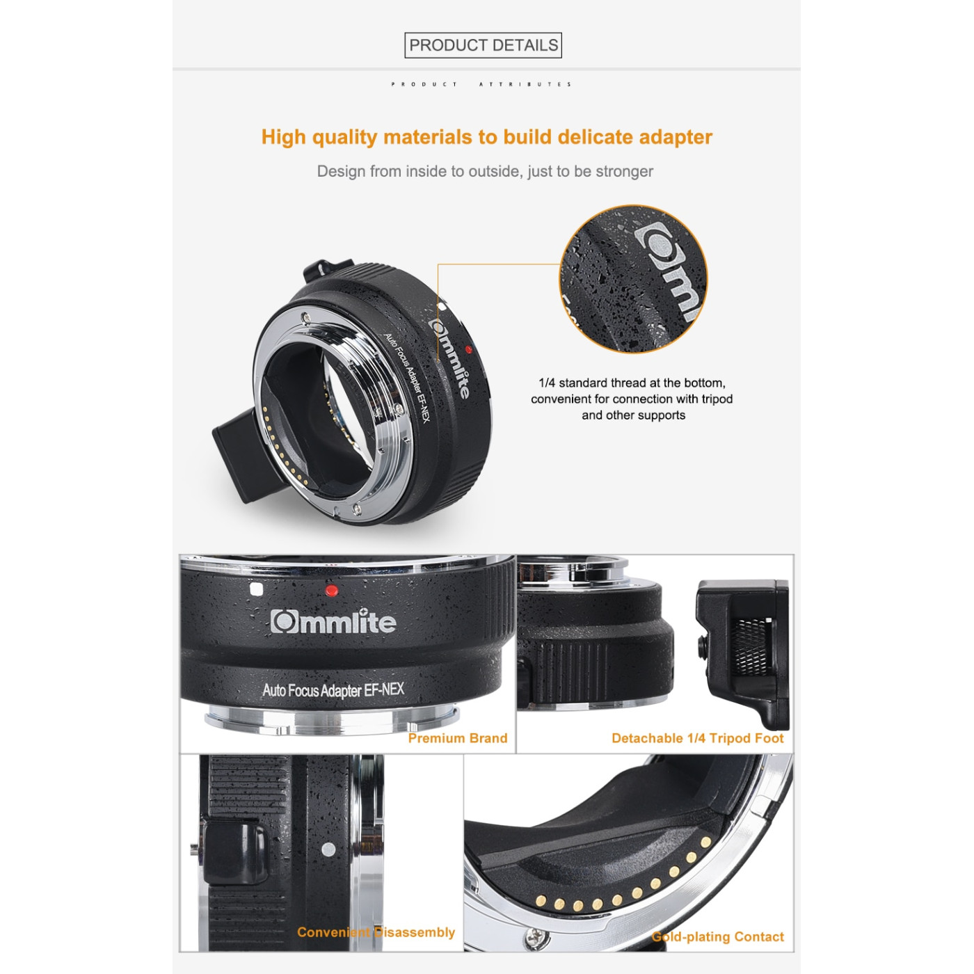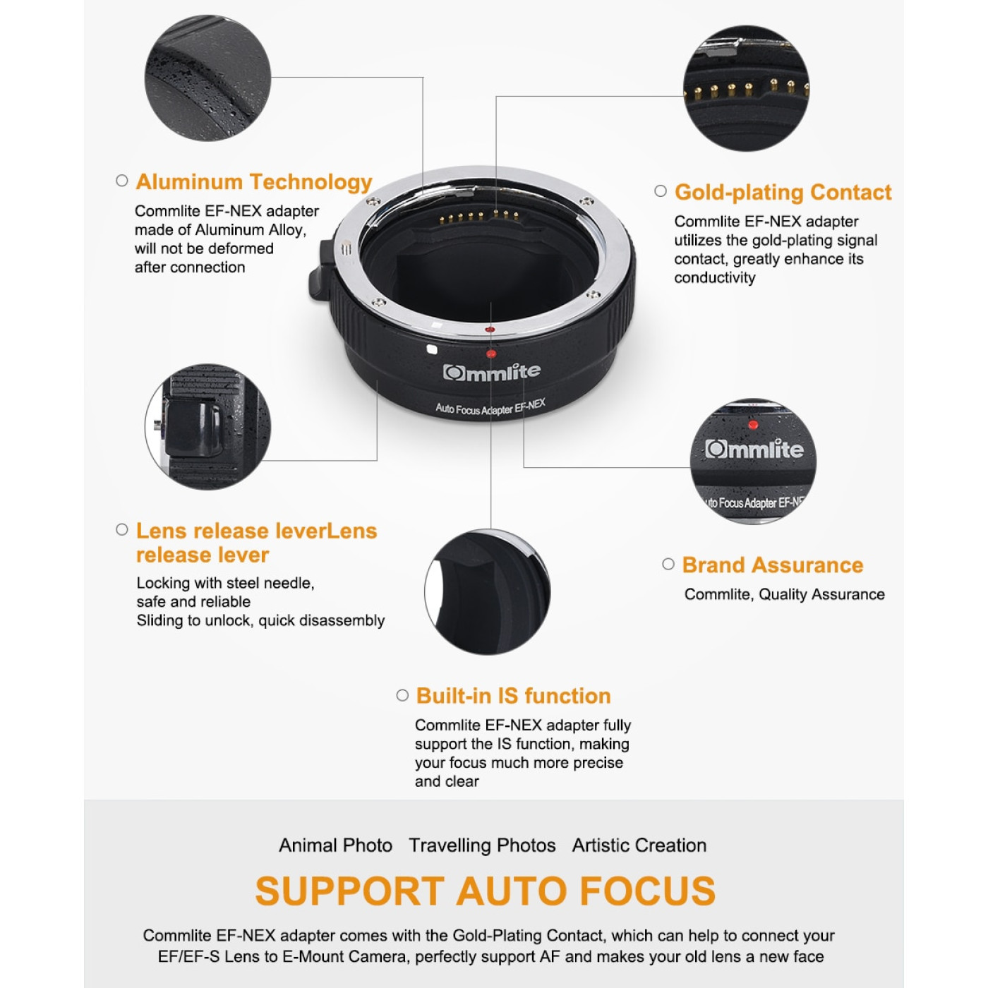 В связи с этим данное переходное кольцо Canon EF – Sony E-mount с электрическими контактами станет очень хорошей альтернативой объективам от фирмы Fujifilm. С использованием данного переходного кольца нет никаких ограничений в использовании оптики Canon: у вас есть возможность использовать все режимы фотокамеры Sony, регулировать диафрагму и пользоваться автофокусировкой.