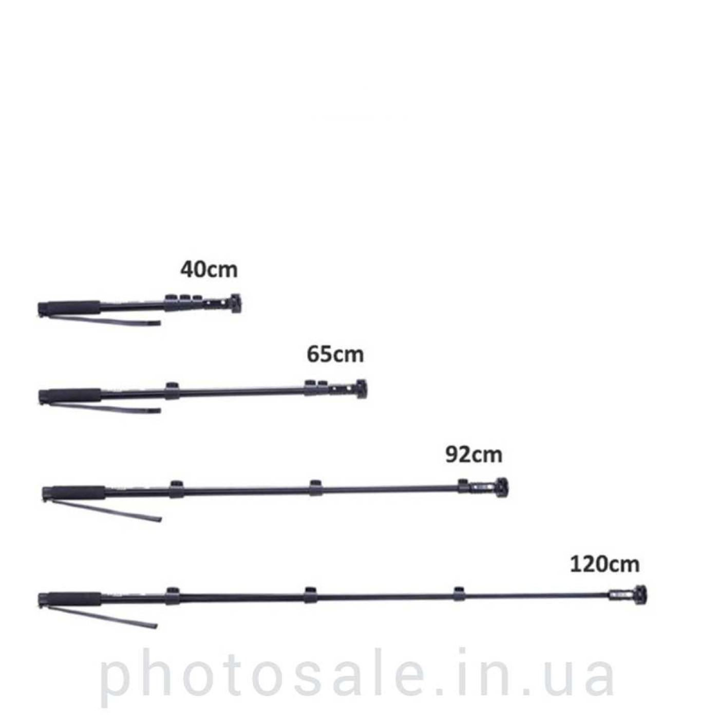 В самой конструкции монопода использован принцип ножки для штатива: три трубки разного диаметра вставлены одна в другую и их можно закрепить на любой длине благодаря пластиковым фиксатором на конце этих трубок. Такой механизм фиксации намного удобнее чем телескопические трубки, которые используются в большинстве дешёвых моноподов. Такая исключительная универсальность монопода позволяет разложить его на длину от 43 до 125 см и закрепить оборудование весом до 2,5 килограммов!