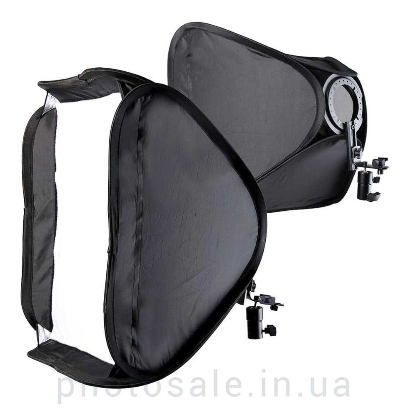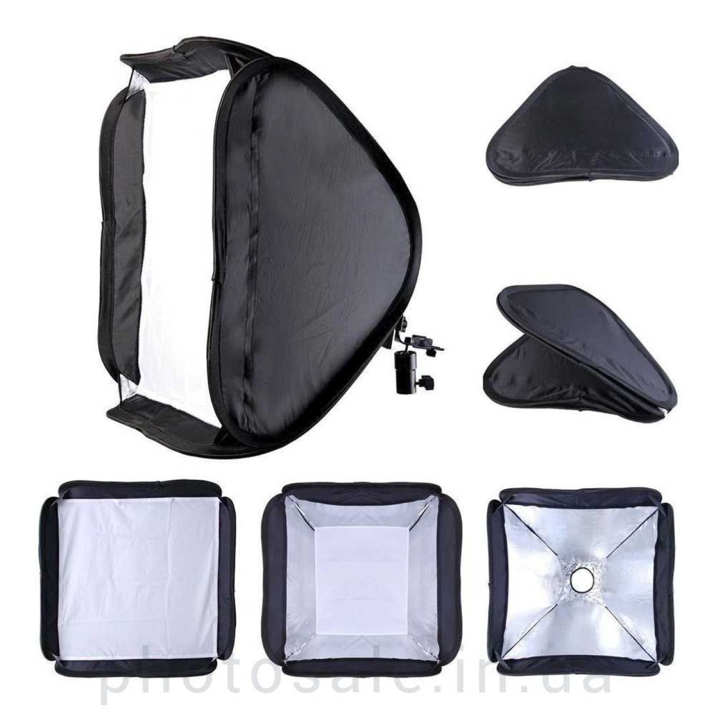 С помощью софтбокса 60х60 см можно получить мягкий, рассеянный и по-студийному контрастный свет, используя те же портативные фотовспышки.