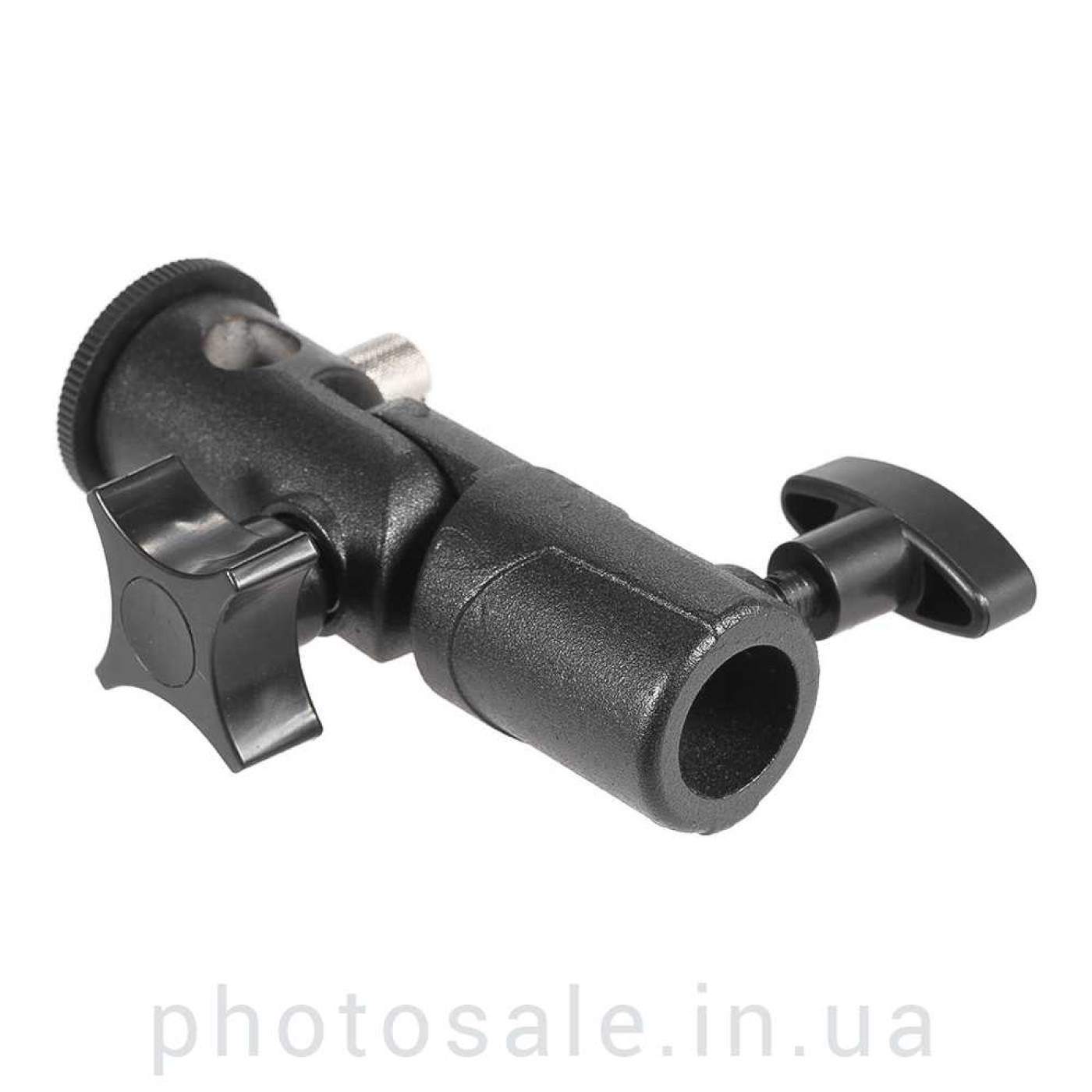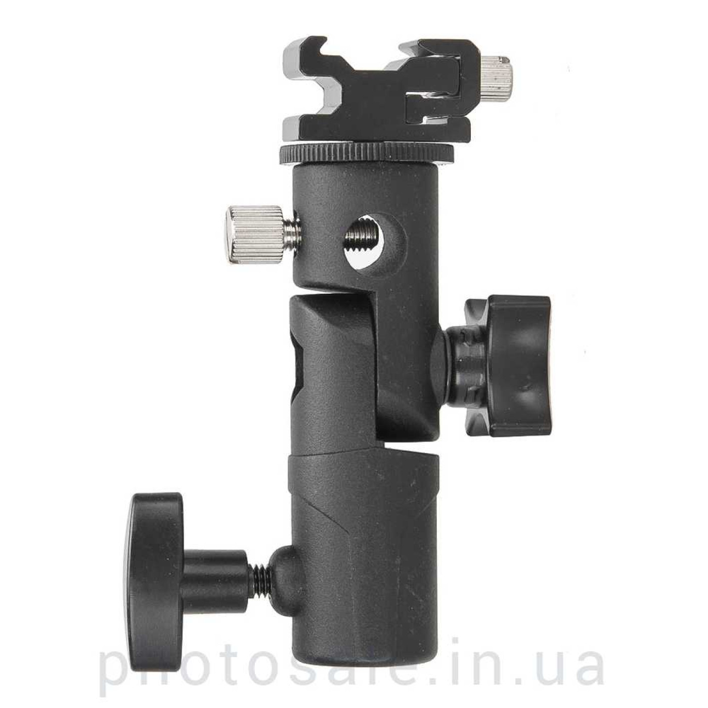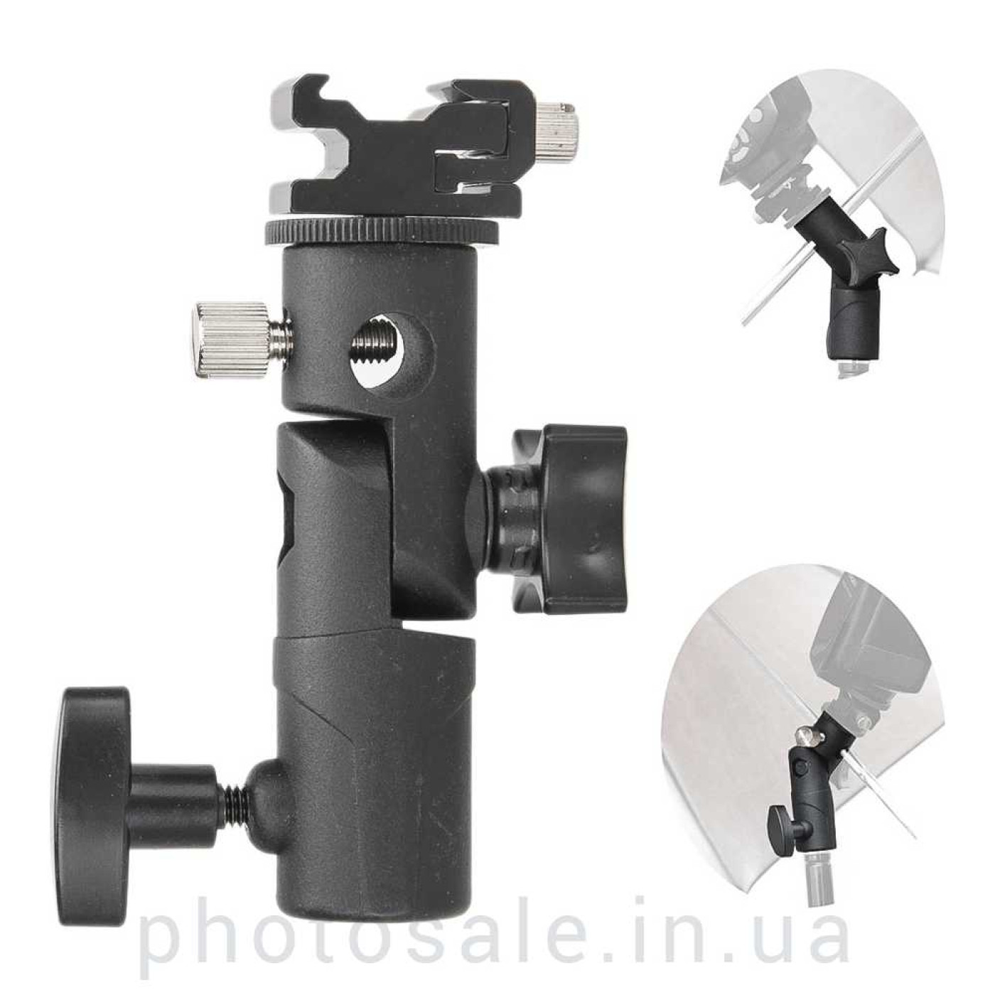 Держатель вспышки и зонта типа E применяется для установки накамерной вспышки и зонта на студийную стойку или фотоштатив. Данный тип держателя функционально аналогичен D-типу, но имеет более компактный размер.