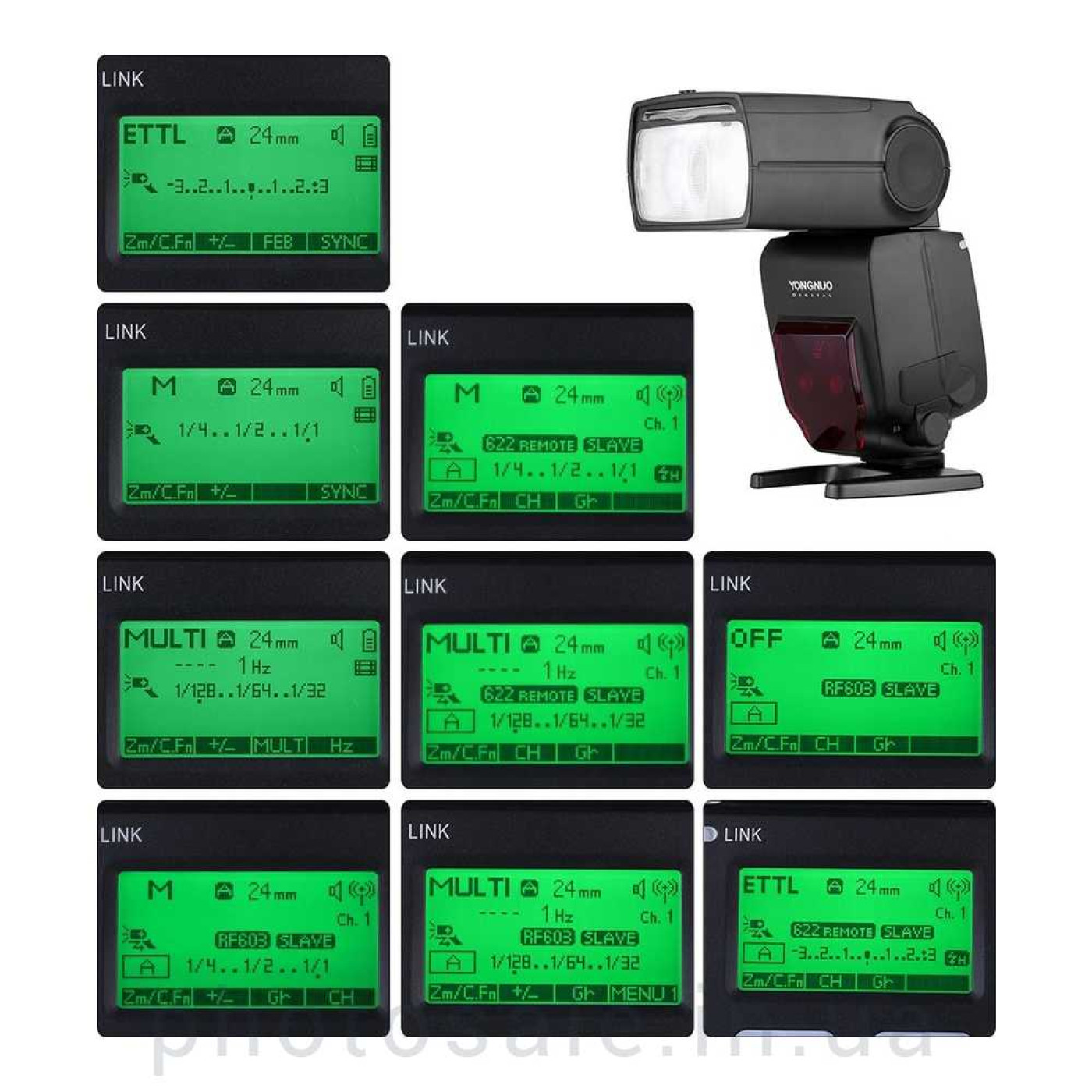 От других моделей Yongnuo YN-685 mark II для Canon отличается наличием встроенного синхронизатора, работающего на частоте 2,4 ГГц. В остальном функционал стандартен и полон: 3 режима работы (автоматический E-TTL II, мануальный М и стробоскопический - Multi-режим).